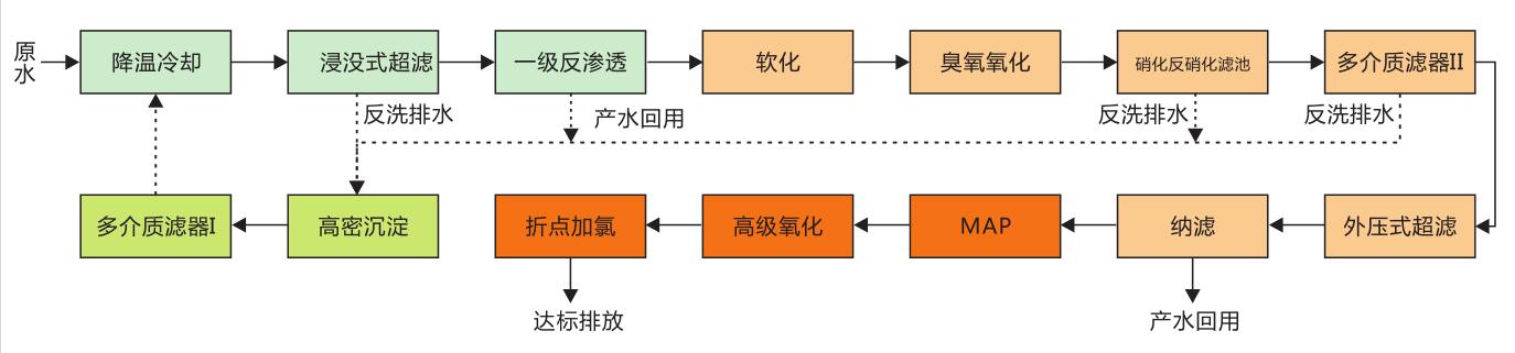 廢水經(jīng)浸沒式超濾和反滲透系統(tǒng)處理后,產(chǎn)水回用,濃水經(jīng)軟化后,進(jìn)入臭氧氧化和硝化-反硝化系統(tǒng),降低水中CODcr、氨氮和總氮等污染物含量,出水經(jīng)過濾后進(jìn)入納濾系統(tǒng),納濾產(chǎn)水作為企業(yè)消防用水,納濾濃水再經(jīng)過MAP和“芬頓+臭氧+BAC”的高級氧化組合工藝處理后,達(dá)到GB13456-2012表3排放標(biāo)準(zhǔn)。