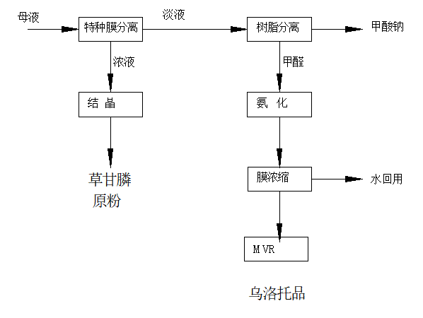針對IDA母液,采用膜分離濃縮取粉,回收其草甘膦的工藝已應(yīng)用多年比較成熟,本公司開發(fā)的新工藝主要針對其含甲醛和甲酸的膜淡液,進(jìn)行污染物減排并資源化回收,其主要方法是利用樹脂法或精餾法分離其中的甲酸,去除甲酸后的甲醛溶液通氨制備烏洛托品后,再通過多級的膜濃縮工藝,濃縮至含量在15%以上,再通過MVR蒸發(fā)結(jié)晶生產(chǎn)烏洛托品,可以獲得含量98%以上的烏洛托品,其回用水中的烏洛托品含量在0.1%以上??梢酝ㄟ^進(jìn)一步的膜分離作為中水回用。